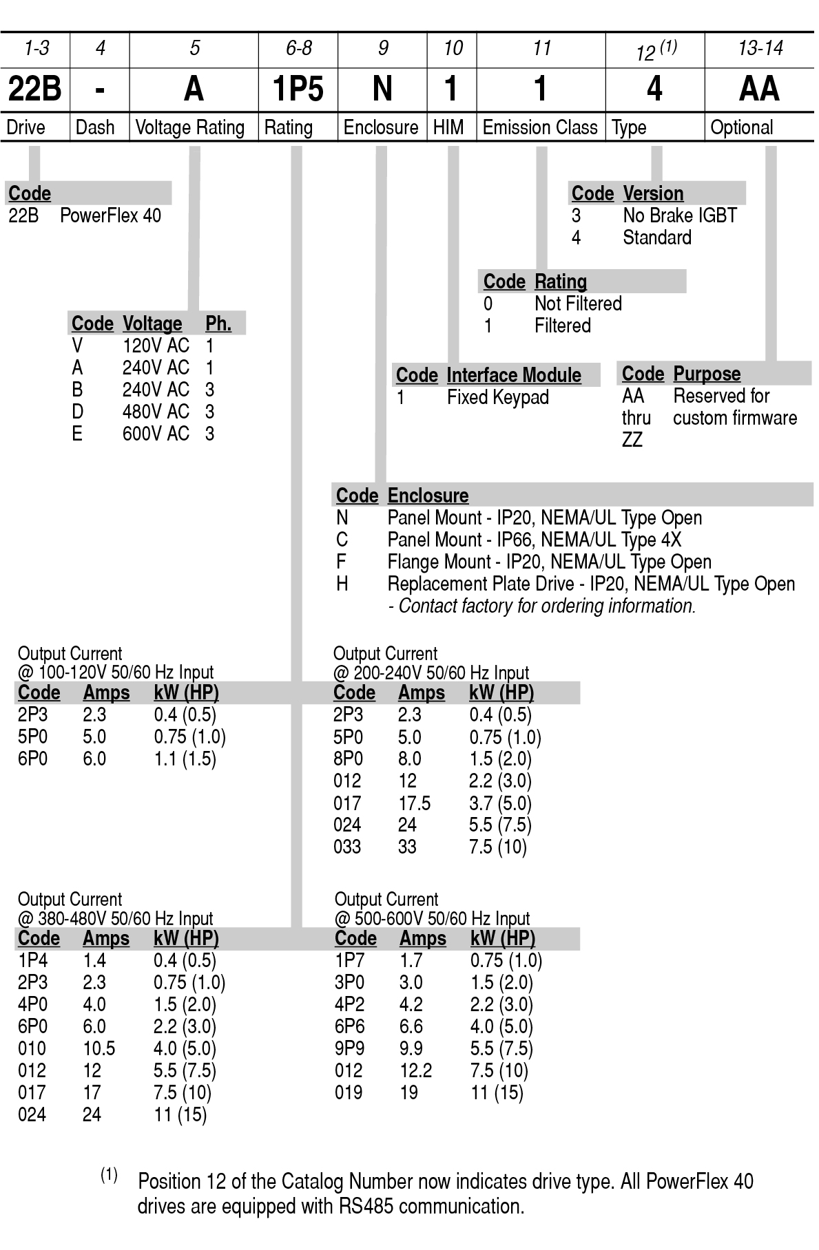 | (1) Meets IP40/54/65 (NEMA 1/12/4/4X) when installed in an enclosure of like rating. (2) Requires use of external DC Bus Inductor or AC Line Reactor. |